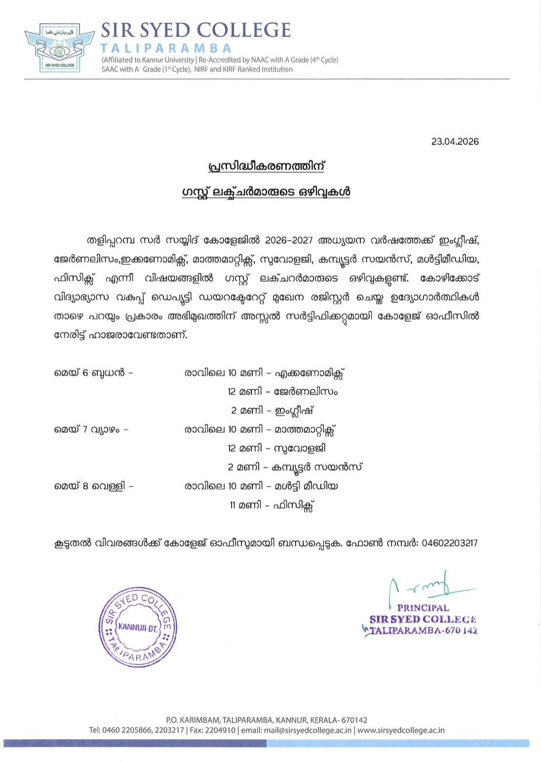Applications are invited for the post of Guest Lecturers at Sir Syed College, Taliparamba, for the academic year 2026-2027. Qualified candidates who have registered their names with the Deputy Directorate of Collegiate Education, Kozhikode, are eligible to attend the walk-in interviews. Candidates must report to the College Office at the scheduled time with all original certificates and supporting documents.